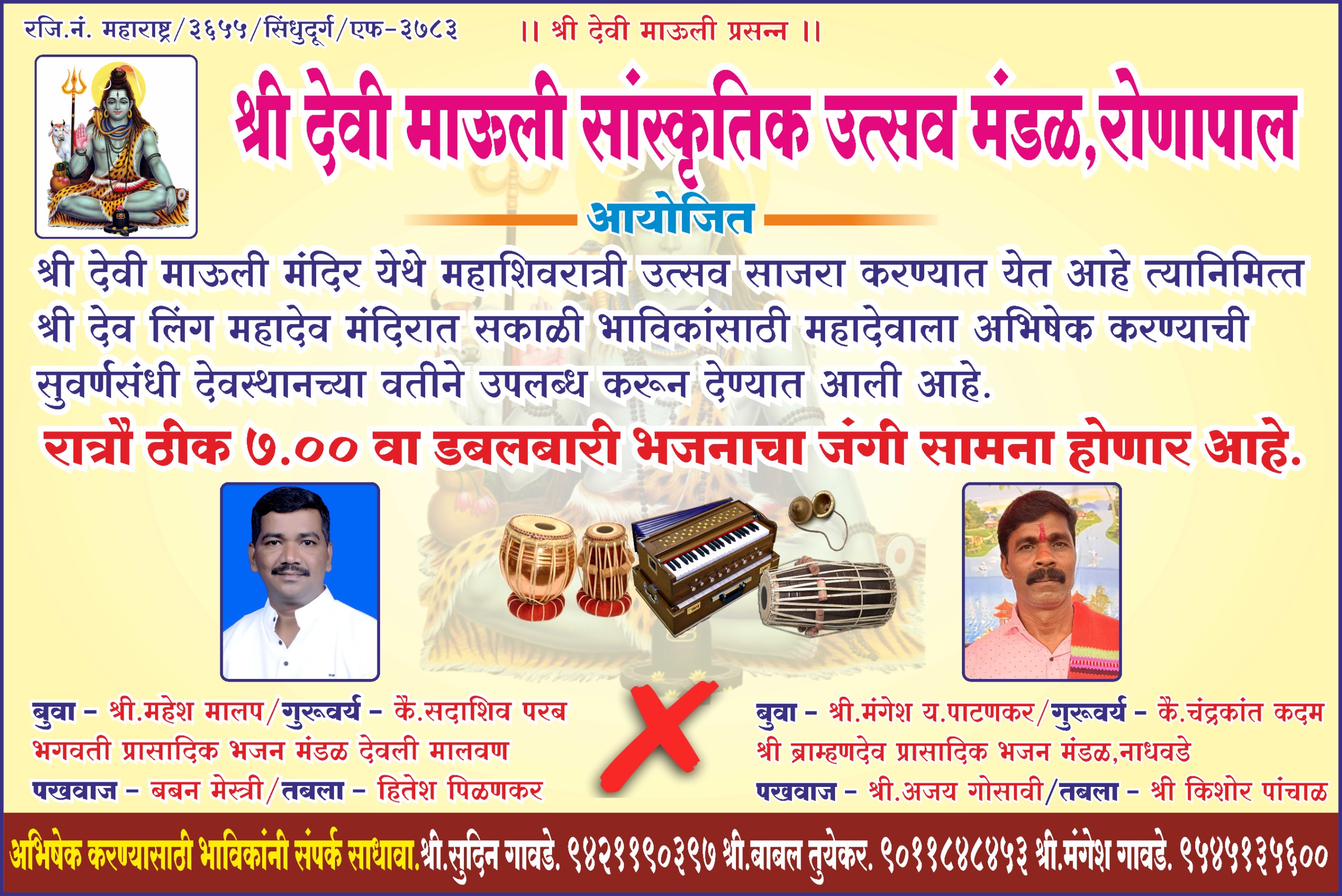 ⚡बांदा ता.०७-: रोणापाल श्री देवी माऊली मंदिर येथे दि. 8 मार्च रोजी महाशिवरात्री उत्सवानिमित्त विविध धार्मिक कार्यक्रमांचे आयोजन करण्यात आले आहे. सकाळी श्री देव लिंग महादेव मंदिरात भाविकांकडून महादेवाला अभिषेक होणार आहे. दिवसभर विविध धार्मिक कार्यक्रम होतील. तसेच संध्याकाळी 7 वा. बुवा महेश मालप व बुवा मंगेश पाटणकर यांच्यामध्ये डबलबारी भजनांचा जंगी सामना होणार आहे. तरी सर्वांनी याचा लाभ घ्यावा असे आवाहन श्री देवी माऊली सांस्कृतिक उत्सव मंडळ, रोणापाल यांच्यातर्फे करण्यात आले आहे.