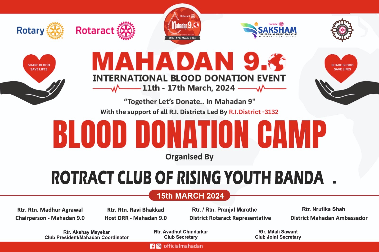 ⚡बांदा ता.१३-: रोटरॅक्ट क्लब ऑफ रायझिंग यूथ बांदा व रोटरी क्लब ऑफ बांदा तसेच सिंधुरक्तमित्र प्रतिष्ठान यांच्या संयुक्त विद्यमाने शुक्रवार दिनांक १५ मार्च रोजी महारक्तदान शिबिराचे आयोजन करण्यात आले आहे. जिल्हा परिषद केंद्र शाळा बांदा नं. १ याठिकाणी ठीक १०.३० वाजता हे शिबीर सुरू होईल. यावेळी बांबूळी येथील ब्लड बँक रक्तसंकलन करणार आहे.