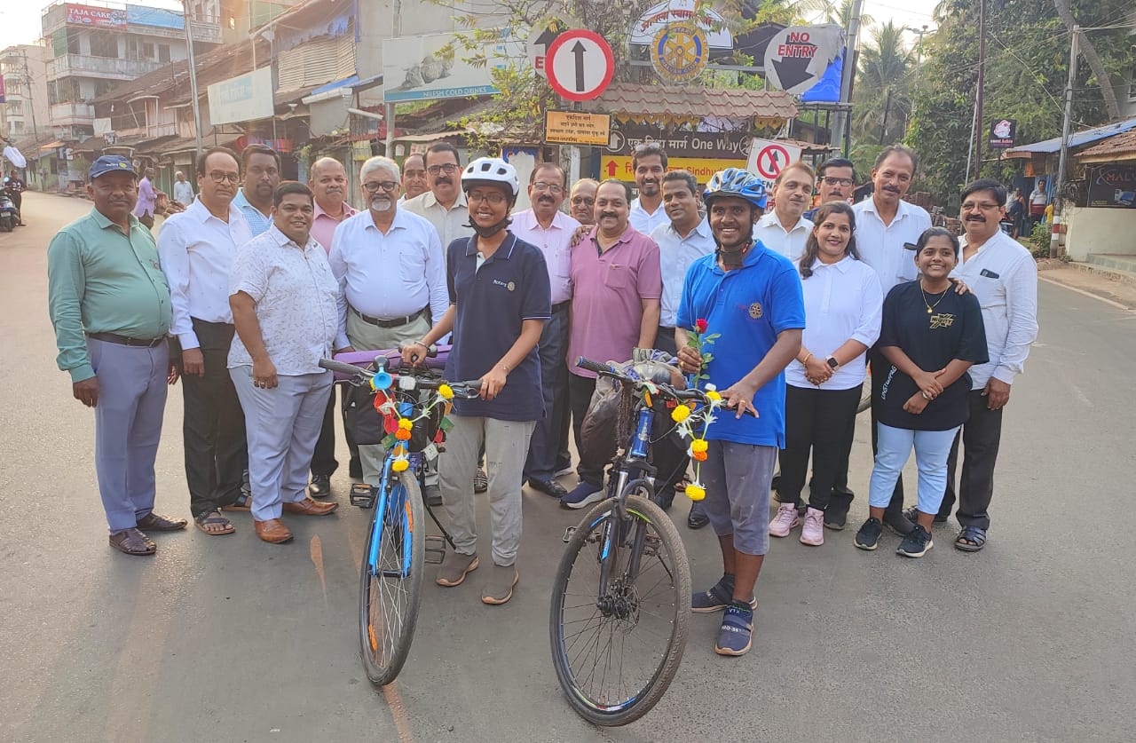 ⚡मालवण ता.२५-: चेन्नई ते गेट वे ऑफ इंडिया (मुंबई) हा सुमारे २ हजार किलोमीटरचा टप्पा सायक्लोथॉन या उपक्रमाद्वारे म्हणजेच सायकल वरून प्रवास करून मानसिक आरोग्य जनजागृती आणि पोलिओ निर्मूलन संदेश देण्यासाठी मोहिमेवर निघालेले रोटरी क्लब ऑफ चेन्नई कोरात्तूर क्लबचे रोटेरियन सतिशकुमार वं रोटरॅक्ट शांकरी हे सायकल द्वारे मालवण शहरात दाखल झाले असता भरड नका येथे रोटरीचे त्यांचे स्वागत डिस्ट्रिक्ट 3170 चे डीजी. रो. नासिरभाई बोरसादवला यांच्यासह संजय पुनाळेकर, राजेश घाटवळ आणि मालवण रोटरी क्लबचे सदस्य यांनी पुष्पगुच्छ देऊन स्वागत केले.