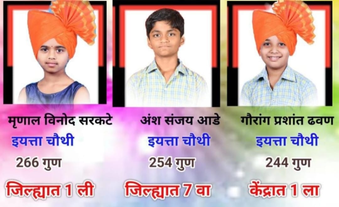कु श्रीकृष्ण माने 196 गुण,परिधी जगताप 170 गुण, आराध्या धावले 162 गुण अभिनव टकले 218 गुण,त्रृतिक चौगुले 202 गुण , कार्तिकी केळकर 174 गुण,मनिष डांगमोडेकर 168 गुण,तर स्वरा शिंदे 132 गुण मिळवले आहेत. यशस्वी विद्यार्थ्यांचे शाळा व्यवस्थापन समिती, मुख्याध्यापक, मार्गदर्शक शिक्षक व पालकांनी अभिनंदन केले.