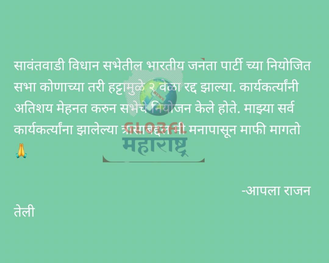 त्यांनी स्टेटस च्या माध्यमातून कार्यकर्त्यांची माफी मागताना नियोजित सभा कोणाच्यातरी हट्टामुळे दोन वेळा रद्द झाल्या कार्यकर्त्यांनी अतिशय मेहनत करून सभेचे नियोजन केले होते त्यामुळे त्यांना झालेल्या त्रासाबद्दल मी मनापासून माफी मागतो चा त्यांनी स्टेटस ठेवून एकीकडे आपली नाराजी ही व्यक्त केली आहे परंतु हट्ट करणारा नेमका व्यक्ती कोण असा प्रश्न आता सावंतवाडी तालुक्यासह भाजपाच्या कार्यकर्त्यांमध्ये पडला आहे एकूणच त्यांचा हा रोष मंत्री दीपक केसरकर यांच्यावर तर नाही ना तेही बोलले जात आहे. दरम्यान याबाबत श्री तेली यांच्याशी संपर्क साधण्याचा प्रयत्न केला असता त्यांचा मोबाईल स्विच ऑफ येत होता.