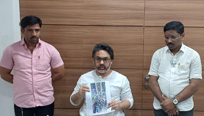 फोटो ओळ:- सिंधुदुर्गनगरी: पत्रकार परिषदेत लांजा तालुक्यातील बोगस पद्धतीने झालेल्या जल जीवन योजनेच्या कामांचे फोटो दाखविताना निलेश राणे सोबत दादा साईल, पप्या टवते