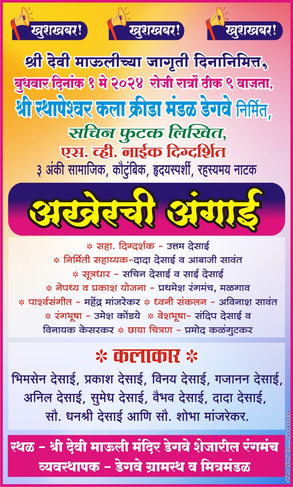 ⚡बांदा ता.२०-: डेगवे येथील श्री देवी माऊलीच्या जागृती दिनानिमित्त बुधवार दिनांक १ मे रोजी रात्री ठीक ९ वाजता श्री स्थापेश्वर कला क्रीडा मंडळ डेगवे निर्मित ‘अखेरची अंगाई’ या तीन अंकी नाट्यप्रयोगाचे श्री देवी माऊली मंदिर रंगमंच येथे आयोजन करण्यात आले आहे.