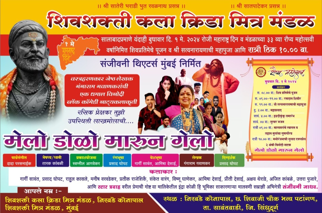 निरवडे कोनापाल येथील शिवशक्ती कला क्रीडा मंडळाच्या ३३व्या रौप्य महोत्सवी वर्षांनिमित्त तसेच महाराष्ट्र दिनानिमित्त कोनापाल शिवाजी चौक येथे शिवप्रतिमा पूजन सत्यनारायण महापूजा व रात्री ठीक दहा वाजता संजीवनी थिएटर मुंबई निर्मित मेलो डोळे मारून गेलो हा धम्माल कॉमेडी आयोजित करण्यात आला आहे. तरी नाट्य रसिकांनी याचा लाभ घ्यावा असे आवाहन मंडळाच्या वतीने करण्यात आले आहे.