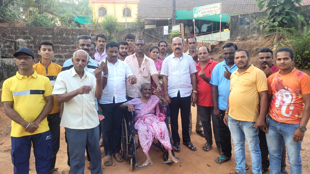 ओरोस ता.०७-:कुडाळ मालवण विधानसभा क्षेत्रातील कुडाळ तालुक्यामधील पणदुर गावतील बूथ क्र.177 मध्ये प्रभावती शत्रुघ्न गोसावी या 86 वर्षीय आजीने व्हीलचेअर वरुन येत मतदानाचा पवित्र हक्क बजावला. यावेळी तिचे भाजप जिल्हाध्यक्ष प्रभाकर सावंत यांनी कौतुक केले. यावेळी भाजपचे ओरोस मंडळ अध्यक्ष दादा साईल यांच्यासह अन्य मतदार उपस्थित होते.
