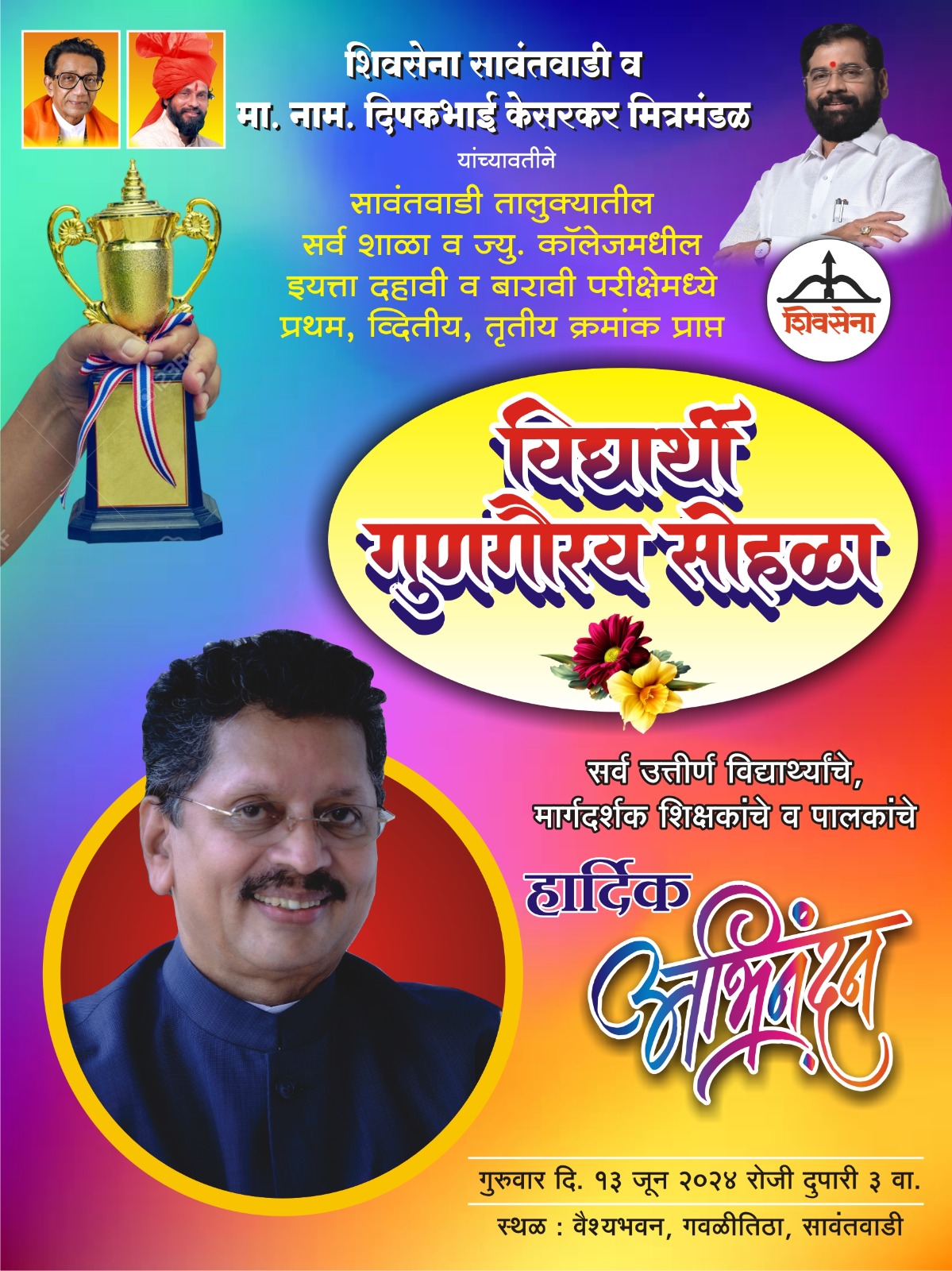 सावंतवाडी तालुक्यातील दहावी बारावी उत्तीर्ण झालेल्या प्रत्येक विद्यालयातील प्रथम तीन विद्यार्थ्यांचा गुणगौरव मान.नाम. दिपक केसरकर मित्रमंडळाच्या वतीने दि.१३ जून रोजी संध्याकाळी ३ वाजता वैश्य भवन येथे आयोजित करण्यात आला आहे.