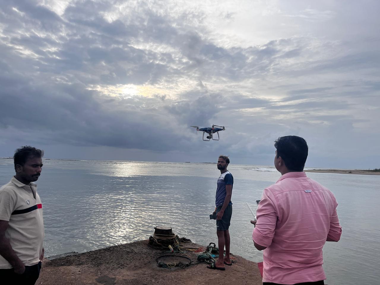 तळाशील खाडीत बुडून बेपता झालेल्या किशोर चोंडणेकर या मच्छिमाराचा ड्रोनच्या मदतीने शोध सूरू आहे त्याचे छायाचित्र.