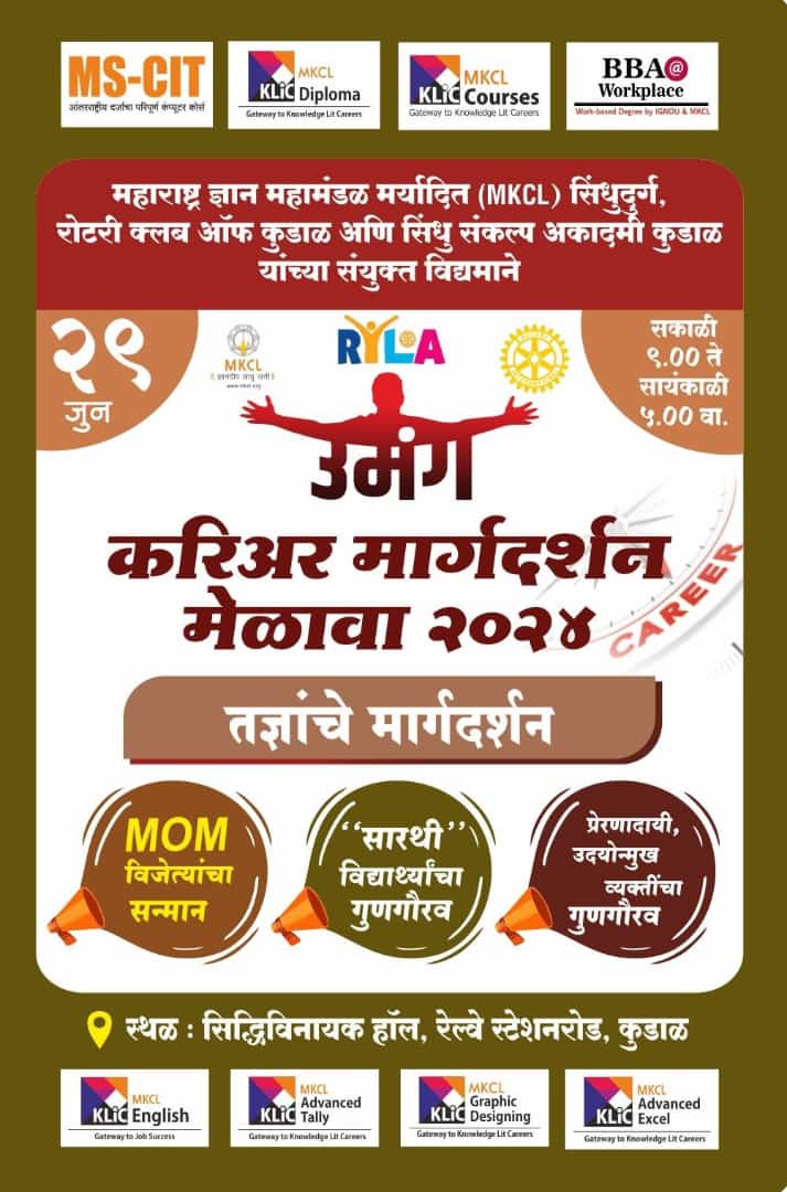 महाराष्ट्र ज्ञान महामंडळ मर्यादित आणि सिंधू संकल्प अकॅडमी कुडाळ यांच्या संयुक्त विद्यमाने उद्या, शनिवार २९ जून रोजी जिल्ह्यातील शालेय विद्यार्थ्यांसाठी ‘उमंग’ हा करियर मार्गदर्शन शिबिर कार्यक्रम आयोजित करण्यात आला आहे. सकाळी ९ ते सायंकाळी ५ वा. या वेळेत सिद्धिविनायक हॉल (रेल्वे स्टेशन रोड) कुडाळ येथे हा कार्यक्रम होणार आहे. हे शिबिर मोफत असून यावेळी करिअरच्या विविध संधी, तंत्रज्ञानातील प्रगती आदी विविध विषयांवर मार्गदर्शन करण्यात येणार आहे, अशी माहिती महाराष्ट्र ज्ञान महामंडळचे जिल्हा समन्वयक प्रणय तेली यांनी पत्रकार परिषदेत दिली.