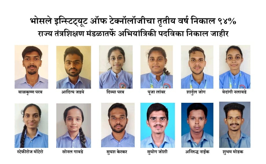⚡सावंतवाडी ता.०२-: महाराष्ट्र राज्य तंत्रशिक्षण मंडळातर्फे पदविका अभियांत्रिकी परीक्षेचा निकाल जाहीर करण्यात आला असून येथील यशवंतराव भोसले इन्स्टिट्यूट ऑफ टेक्नॉलॉजीचा निकाल ९४ टक्के लागला आहे. तृतीय वर्ष पदविका अभियांत्रिकी परीक्षेसाठी कॉलेजमधून एकूण २०४ विद्यार्थी बसले होते. त्यापैकी १९१ विद्यार्थी उत्तीर्ण झाले आहेत.