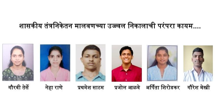 ⚡मालवण ता.०५-: महाराष्ट्र राज्य तंत्रशिक्षण मंडळामार्फत घेण्यात आलेल्या प्रथम, द्वितीय व तृतीय वर्ष अभियांत्रिकी पदविका अभ्यासक्रमाचा निकाल जाहीर झाला असून येथील शासकीय तंत्रनिकेतन मालवण मधील विद्यार्थ्यांनी भरघोस यश संपादन केले आहे.