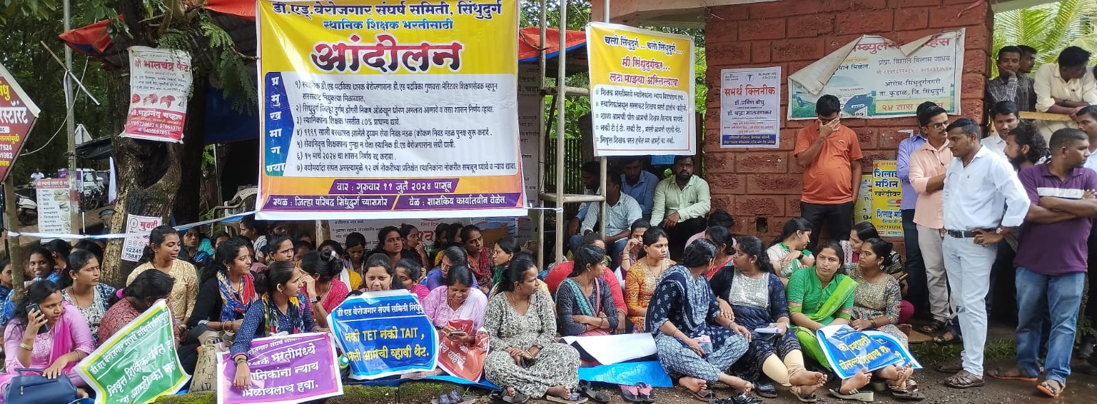 सिंधुदुर्ग जिल्ह्यातील रिक्त असलेल्या शिक्षक भरतीत स्थानिक डी एड पदविका धारक बेरोजगार उमेदवारांना सरसकट शिक्षण सेवक म्हणून सामावून घ्यावे. या मागणीसाठी डी एड बेरोजगार संघर्ष समितीच्या वतीने आज जिल्हा परिषदेसमोर धरणे आंदोलन छेडण्यात आले आहे.