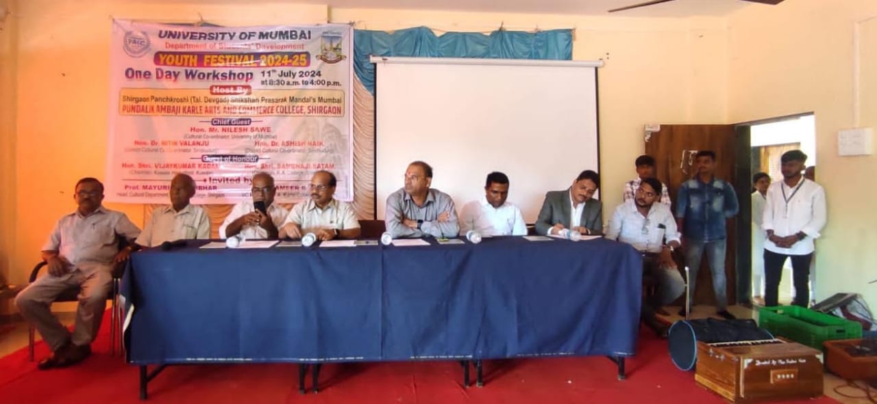 कुडाळ : मुंबई विद्यापीठाच्या ५७ व्या आंतरमहाविद्यालयीन विभागीय युवा महोत्सव कार्यशाळेचे आयोजन शिरगाव येथील पुंडलिक अंबाजी कर्ले महाविद्यालयामध्ये करण्यात आले होते. यावेळी मुंबई विद्यापीठाचे सांस्कृतिक समन्वयकडॉ.निलेश सावे यांनी विद्यार्थी आणि प्राध्यापकांना कला सादरीकरण बाबत मार्गदर्शन केले. या कार्यशाळेस सिंधुदुर्ग जिल्ह्यातील ४० महाविद्यालयांचे प्रतिनिधी व विद्यार्थी उपस्थित होते.