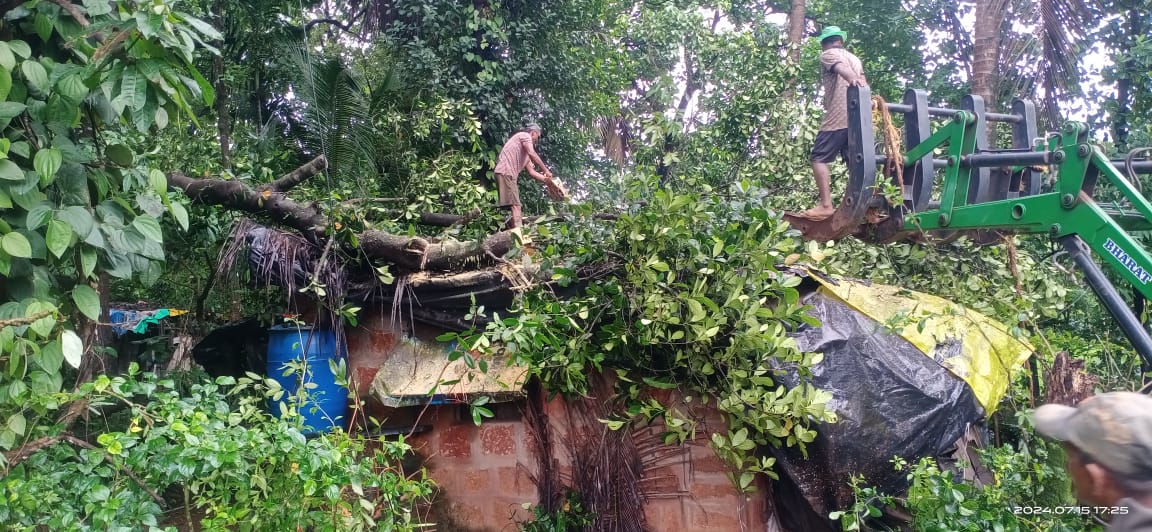 बांदा परिसरात गेले दोन दिवस मुसळधार पाऊस कोसळत आहे. शेर्ले येथील पालव यांच्या घरानजीक असलेले भलेमोठे फणसाचे झाड पालव यांच्या घरावर कोसळले. यामध्ये घराच्या छपराचे तसेच व घरातील सामानाचे मोठ्या प्रमाणात नुकसान झाले. स्थानिकांनी तात्काळ घटनास्थळी धाव घेत झाड बाजूला केले. महसूल विभागाकडून पंचनामा करण्याचे काम सुरु होते.