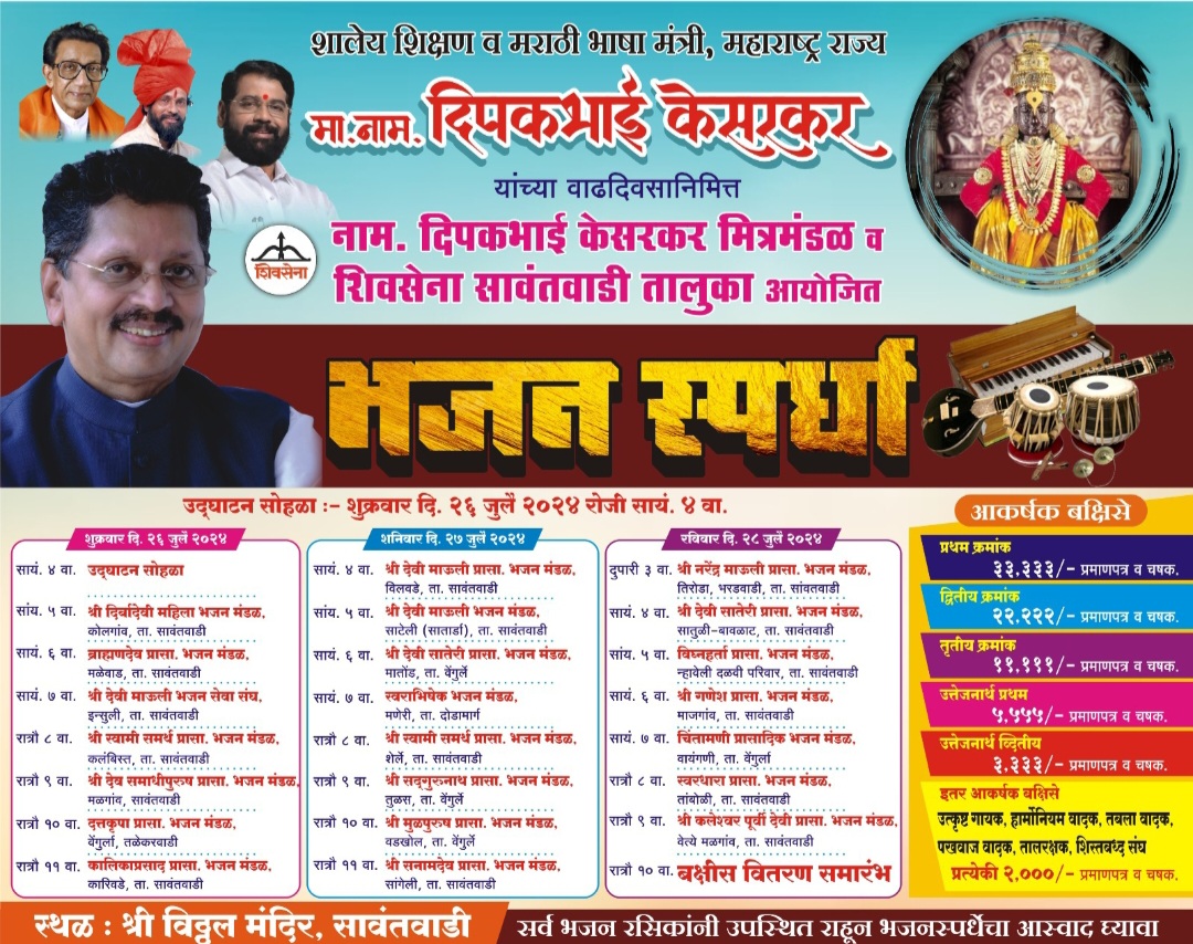 या स्पर्धेमध्ये सावंतवाडी विधानसभा मतदार संघातील नावाजलेल्या भजनी मंडळाची भजने सादर होणार आहेत. तरी मोठ्या संख्येने उपस्थित राहून या भजनांचा आस्वाद घ्यावा ही विनंती. दिपकभाई केसरकर मित्र मंडळ सावंतवाडी व शिवसेना सावंतवाडी