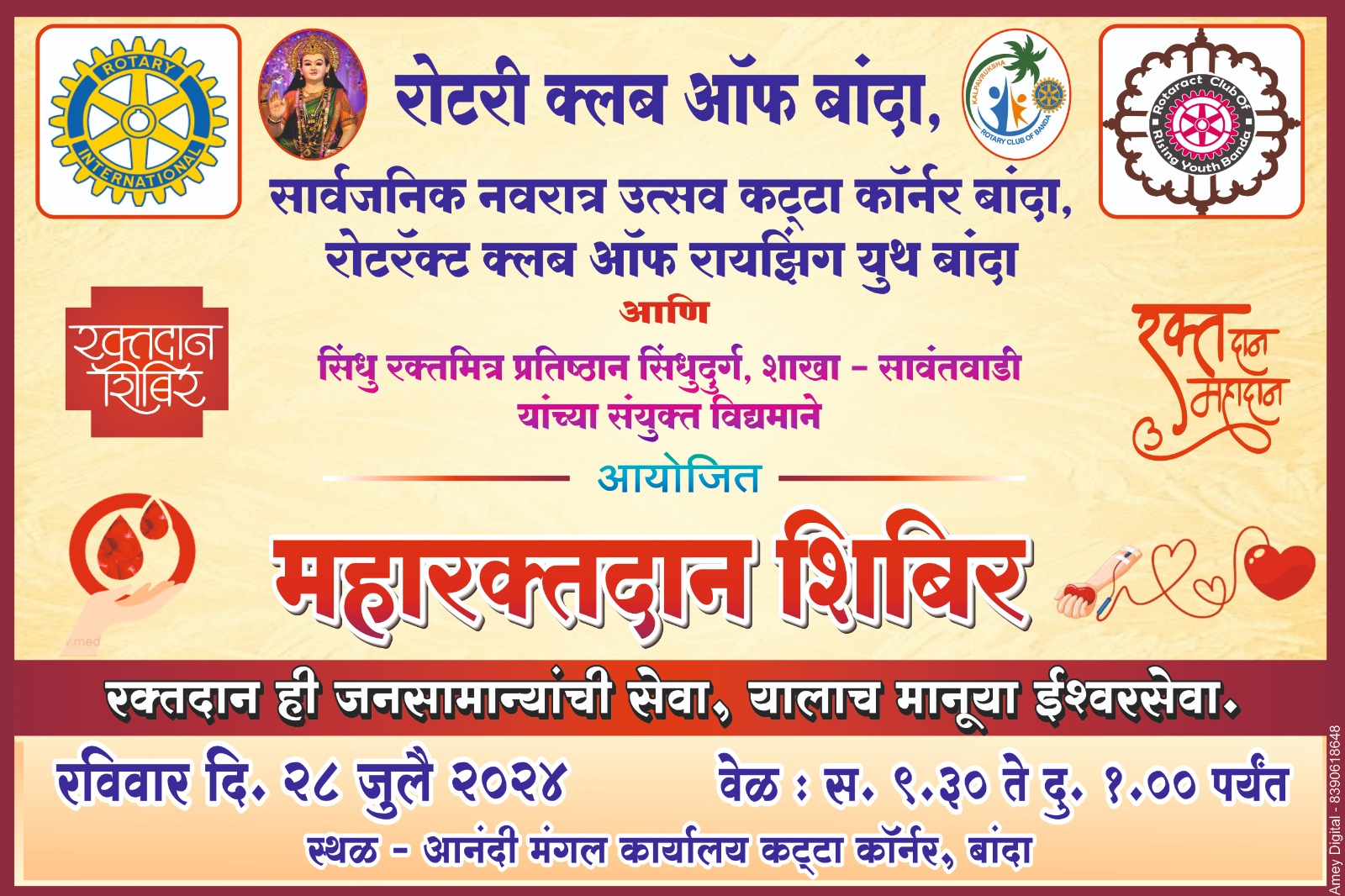 बांदा ता.२६-: रोटरी क्लब ऑफ बांदा, सार्वजनिक नवरात्र उत्सव कट्टा कॉर्नर बांदा, रोट्रॅक क्लब ऑफ रायझिंग युथ बांदा आणि सिंधु रक्तमित्र प्रतिष्ठान सिंधुदुर्ग शाखा सावंतवाडी यांच्या संयुक्त विद्यमाने रविवार दिनांक २८ रोजी महारक्तदान शिबिराचे आयोजन करण्यात आले आहे.