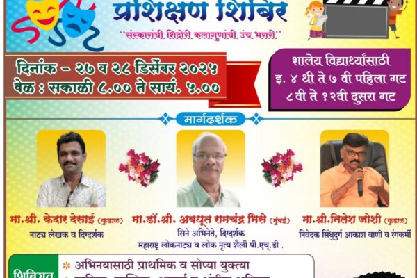 नामवंत रंगकर्मी करणार मार्गदर्शन.. ⚡कुडाळ ता.२५-: तालुक्यातील चेंदवण शिक्षणोत्तेजक मंडळ, मुंबई संचलित श्री देवी माऊली माध्यमिक विद्यालय, चेंदवण येथे शालेय विद्यार्थ्यांमधील कला-गुणांना वाव देण्यासाठी नाट्य व अभिनय प्रशिक्षण शिबिराचे आयोजन करण्यात आले आहे. हे शिबिर दि. २७ व २८ डिसेंबर २०२५ रोजी सकाळी ८ ते सायंकाळी ५ या वेळेत होणार आहे.या प्रशिक्षण शिबिराचे मुख्य उद्दिष्ट…