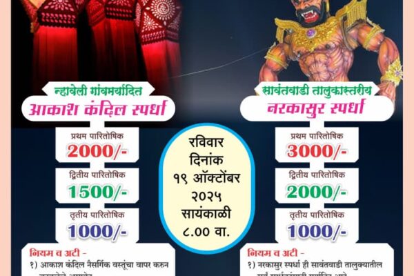 कलंबिस्तचे स्वामी समर्थ भजन मंडळ द्वितीय तर नेरुरचे मोरेश्वर भजन मंडळ तृतीय.. सावंतवाडी शहरातील बाजारपेठ नवरात्रोत्सव मित्रमंडळाच्यावतीने आयोजित करण्यात आलेल्या जिल्हास्तरीय निमंत्रित भजन स्पर्धेत पिंगुळीच्या श्री देव रवळनाथ प्रासादीक भजन मंडळ ( बुवा रूपेश यमकर ) याने प्रथम क्रमांक पटकाविला. या भजन स्पर्धेत कलंबिस्तच्या श्री स्वामी समर्थ प्रासादीक भजन मंडळ ( बुवा संतोष धर्णे )…