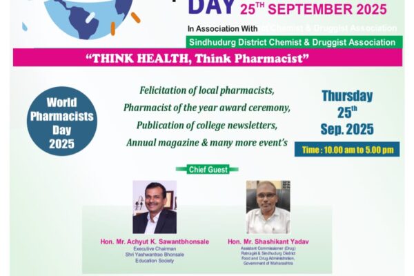⚡सावंतवाडी ता.२४-: यशवंतराव भोसले कॉलेज ऑफ फार्मसी आणि सिंधुदुर्ग जिल्हा केमिस्ट अँड ड्रगिस्ट असोसिएशन यांच्या संयुक्त विद्यमाने उद्या २५ सप्टेंबर रोजी जागतिक फार्मासिस्ट दिन साजरा केला जाणार आहे. संपूर्ण जगभरात साजरा करण्यात येणाऱ्या या दिनाची उद्यासाठी थीम “थिंक हेल्थ, थिंक फार्मासिस्ट” अशी आहे._ कार्यक्रमाला प्रमुख पाहुणे म्हणून रत्नागिरी व सिंधुदुर्ग जिल्ह्याचे सहाय्यक आयुक्त, अन्न व…