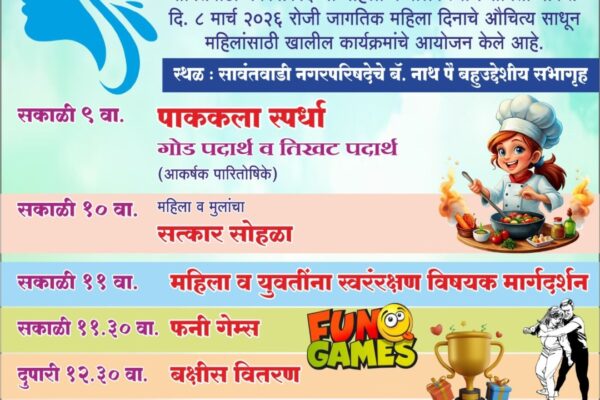 ⚡सिंधुदुर्गनगरी ता.०४-:कसाल (ता. कुडाळ, जि. सिंधुदुर्ग) : ग्रामपंचायत कसाल यांच्या वतीने ८ मार्च जागतिक महिला दिनानिमित्त शनिवारी दि. ७ मार्च २०२६ रोजी सकाळी १० वाजता महिला मेळाव्याचे आयोजन करण्यात आले आहे. हा कार्यक्रम कसाल बाजारपेठ येथील सिद्धिविनायक मंगल कार्यालयात पार पडणार असून महिला सक्षमीकरणाचा संदेश देणारे विविध उपक्रम यावेळी राबविण्यात येणार आहेत. कार्यक्रमाचे उद्घाटन जिल्हा…