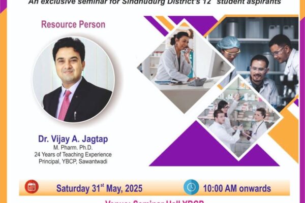 भोसले फार्मसी कॉलेजचे आयोजन… ⚡सावंतवाडी ता.२८-: यशवंतराव भोसले फार्मसी कॉलेजच्या वतीने शनिवार, दि.३१ मे रोजी सकाळी १० वाजता बारावी उत्तीर्ण विद्यार्थ्यांसाठी फार्मसी अभ्यासक्रमावर मार्गदर्शन सत्राचे आयोजन करण्यात आले आहे. राज्य सामाईक प्रवेश परीक्षा कक्ष व तंत्रशिक्षण विभागाच्या वतीने ऑनलाईन प्रवेश प्रक्रिया सुरु होत आहे. याच पार्श्वभूमीवर विद्यार्थ्यांना प्रवेश प्रक्रियेचे टप्पे, आवश्यक कागदपत्रे, शासकीय शिष्यवृत्ती तसेच…