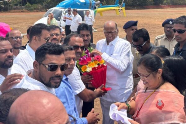 ⚡वेंगुर्ला ता.२४-: राष्ट्रवादीचे नेते शरद पवार आज सिंधुदुर्ग जिल्हा दौऱ्यावर आले असून यावेळी वेंगुरला कॅम्प येतील हेलिपॅडवर सावंतवाडी राष्ट्रवादीचे तालुकाध्यक्ष पुंडलिक दळवी यांनी पुष्पगुच्छ देऊन त्यांचे स्वागत केले. यावेळी शहराध्यक्ष देवेंद्र टेमकर, नवल साटेलकर, बंटी कांबळी, विशाल बागायतकर,आदी उपस्थित होते